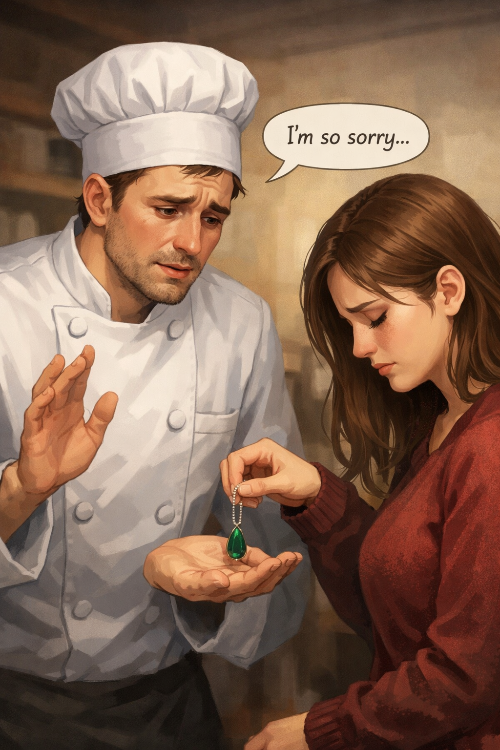 Ethan writes an apologetic note to his girlfriend Esther, expressing remorse for neglecting their relationship due to his demanding career as a chef. When Esther returns, she returns a pendant he gave her, saying it felt more like an apology than a gift, highlighting his ongoing failure to separate work from personal life.